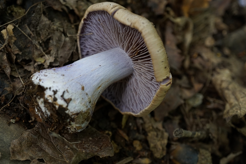 秋、アカマツ林や雑木林内の地上に散生〜少数群生する。カサの径は8cmくらい、はじめ饅頭形、のち丸山形から平らに開く。表面は繊維状、湿時粘性あり、中央で褐色〜黄土褐色、周辺は淡色で紫色をおびる。ヒダは上生し、はじめ紫色のち肉桂褐色で密。柄は根元で極端に膨らむ。表面は繊維状、淡紫色、傷つくと濃紫色になる。