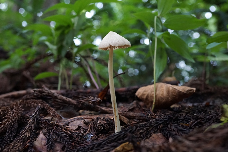 初夏〜秋、カラマツやアカマツなどの針葉樹林内や広葉樹雑木林などさまざまな林内に発生する。カサの径は3cmくらい、はじめ円錐形、のち丸山形からほぼ平らに開くが、中央部は突出する。表面は白色、繊維状で成熟するとしばしば放射状に裂ける。ヒダは離生し、はじめ白色のち灰褐色で密。柄は傘と同色、上下同幅で平滑。