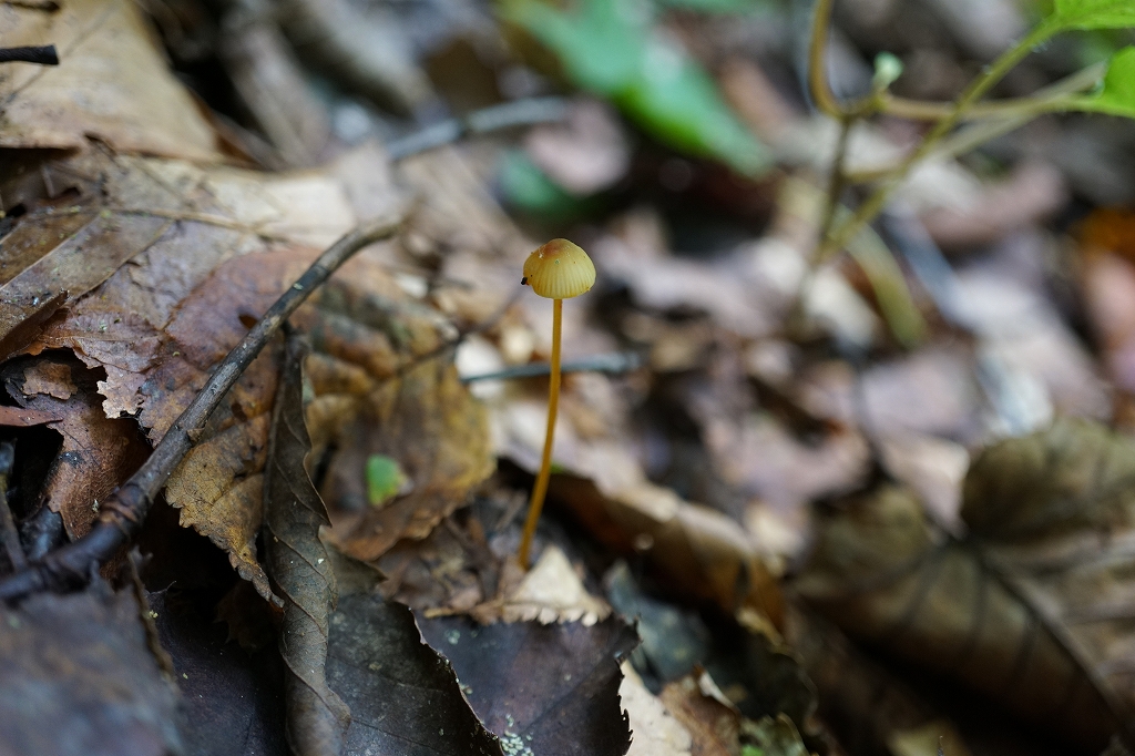 晩秋、ブナ林内の地面に落ちた堅果から群生。傘は0.6cmくらい、初め円錐状釣鐘、のち丸山形、中央多少窪むか平ら、または中高。表面は淡黄色、平滑、湿時弱い粘性あり、条線が現れる。ひだは直生状垂生、白色〜淡黄色、疎。柄は上下同幅、中空、根元は根状に長く伸び、ブナの堅果に付き、全体でときに20cmを超える。表面は淡黄白色〜黄色〜山吹色、基部は長い軟毛に覆われている。