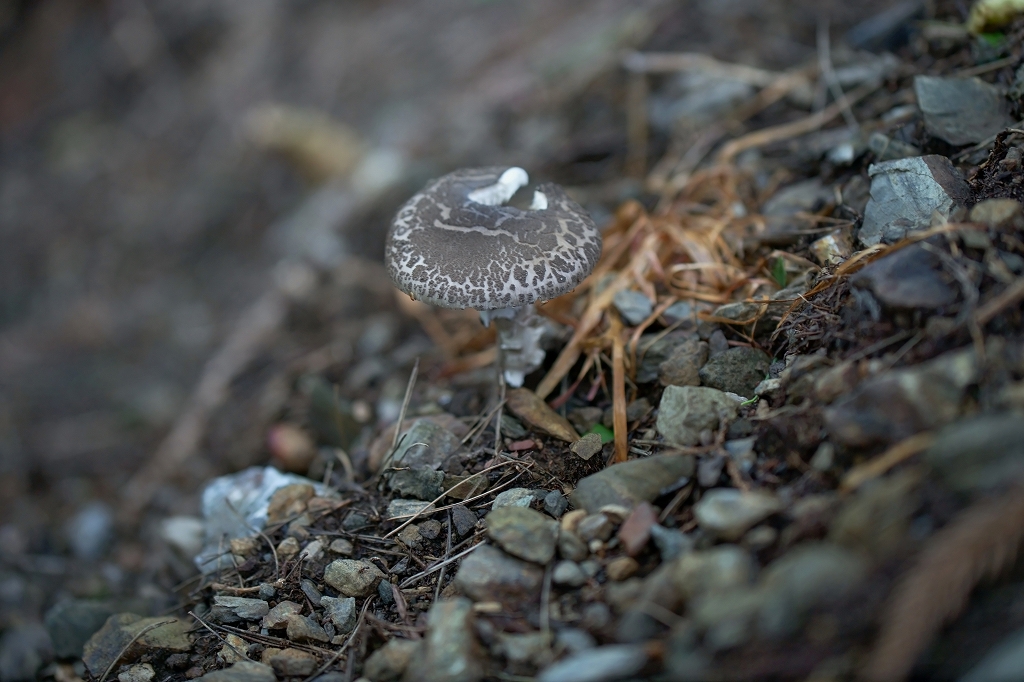 夏〜初秋、アカマツが混じったミズナラなどの雑木林内の地面に散生〜少数群生する。傘は初め饅頭形、のち平らに開き、表面は帯灰褐色〜暗灰褐色。初め黒褐色粉質の破片が有るが、破片はのちひび割れて散在する。ひだは白色で、密。柄は灰色〜灰褐色、繊維状細鱗片に覆われ、上部に黒く縁取られた灰白色膜質のツバをつける。根元は球根状に膨らみ、黒褐色のつぼの破片を環状に付着する。