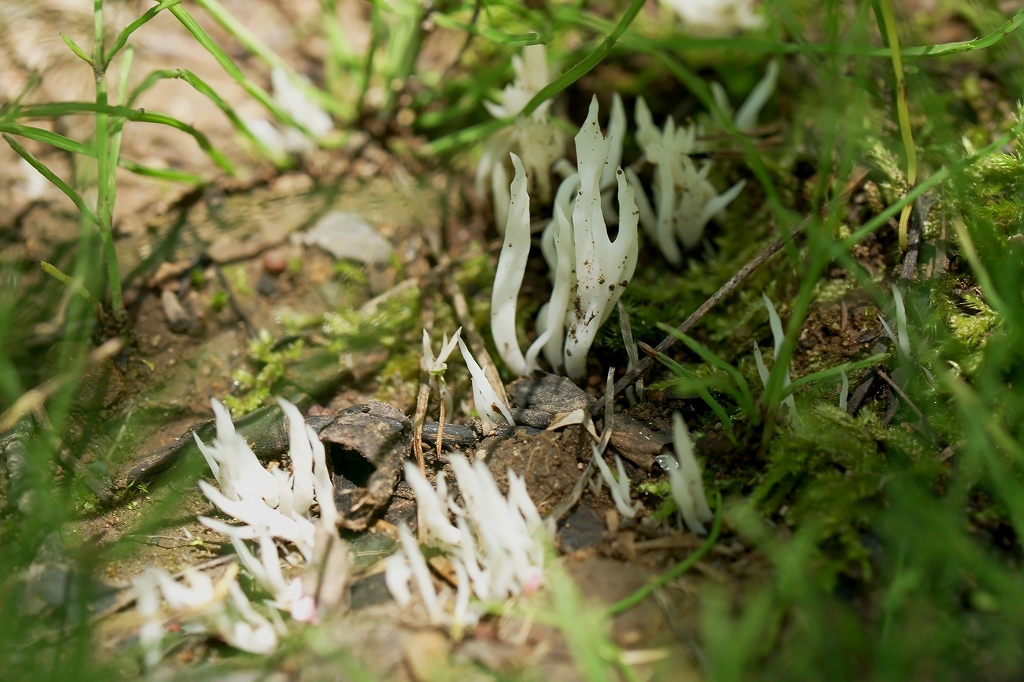 夏〜秋、雑木林上に発生する。単一でこん棒状、ときに先端が枝分かれする。白色〜クリーム色で、表面に浅い縦しわがある。