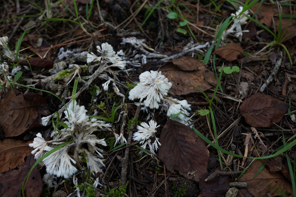 夏〜秋、地面上の落枝、蘚類、植物の茎葉など種々の物体の表面に這い上がって現れる。子実体は、幼菌時は乳白色、ろう状肉質、表面は堅く脆い。熟時には褐色。