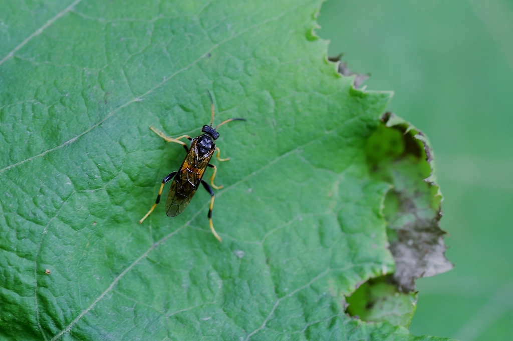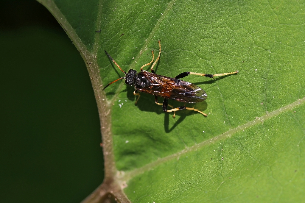 クロムネハバチと良く似ているが、翅をすかして見える腰の部分が赤褐色に見える。