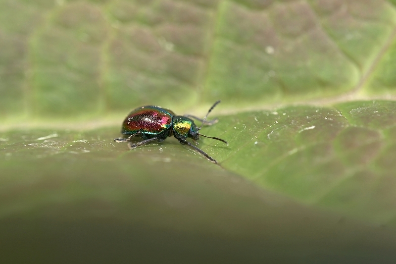 頭は緑色で、上翅は虹色の金属光沢が有る、とても綺麗なハムシ。