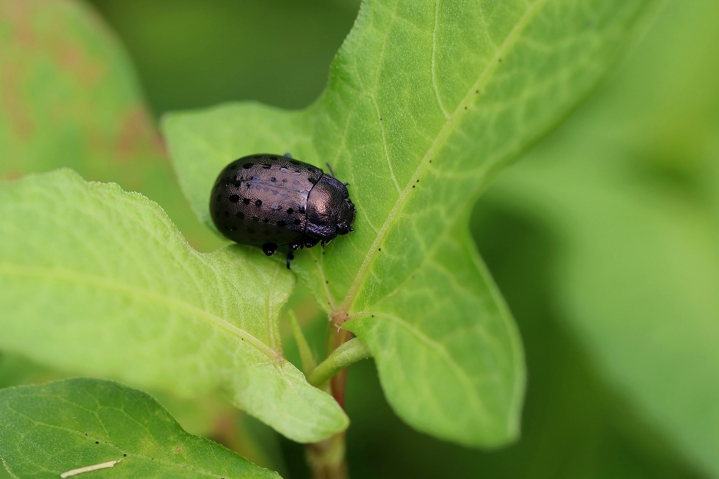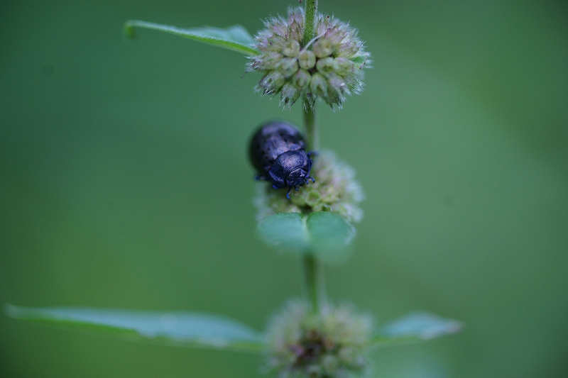 金銅色に鈍く光り、上翅に、縦に並ぶ丸い平滑隆起を持つ。ハッカ、アキギリ、アオジソ、ホトケノザなどの葉を食べる。