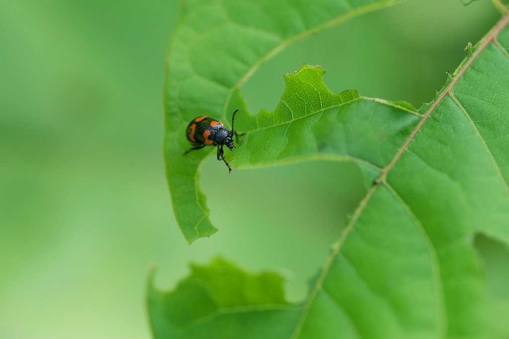 黒色で、上翅にオレンジ色の斑紋を持つハムシ。林縁、草地、畑、土手などに普通に見られ、イタドリやスイバの葉を食べる。
