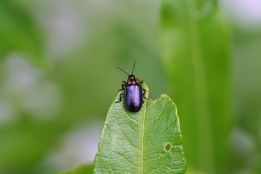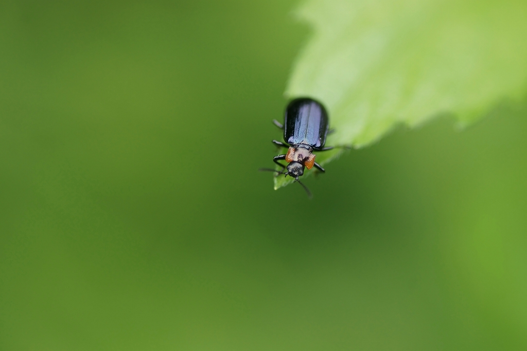 体長5〜7mmほど。黒色で平たく、上ばねは長方形で暗青から紫青色の光沢がある。前胸は全体または両側が橙黄色。成虫は5〜8月に出現する。オニグルミ、サワグルミが食草。