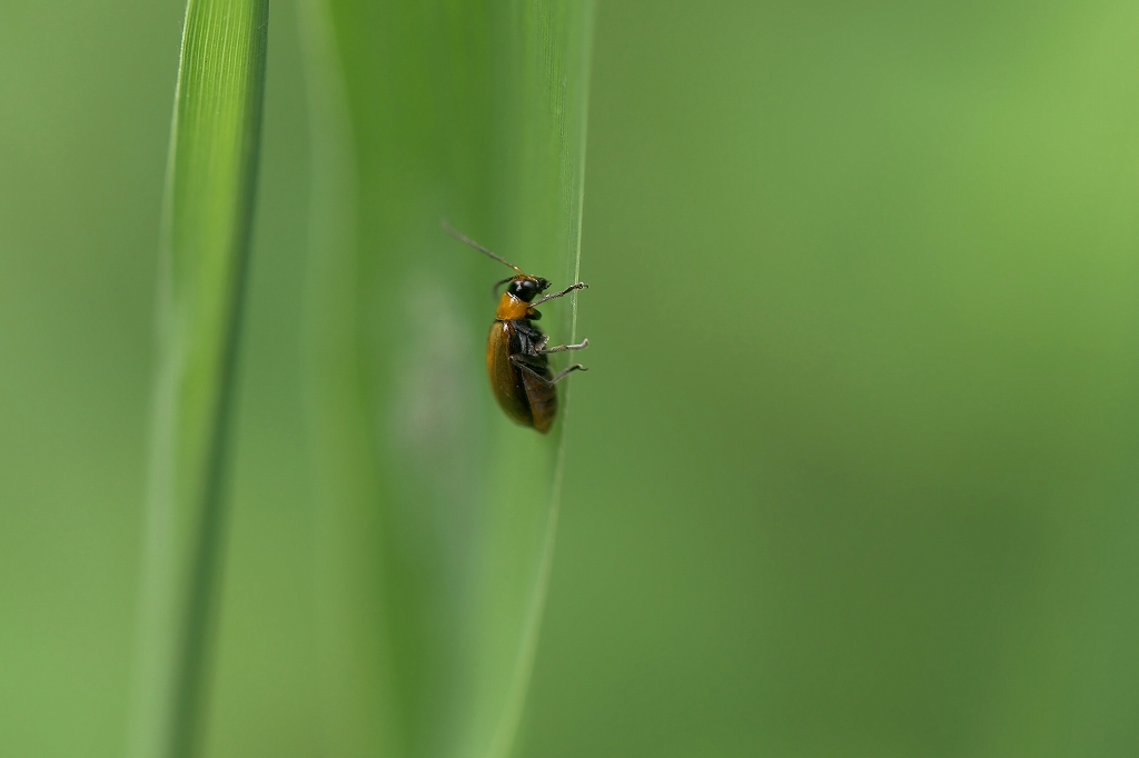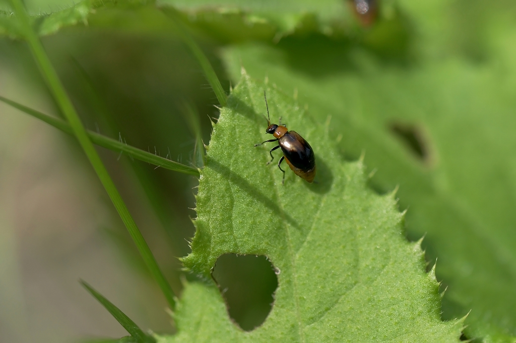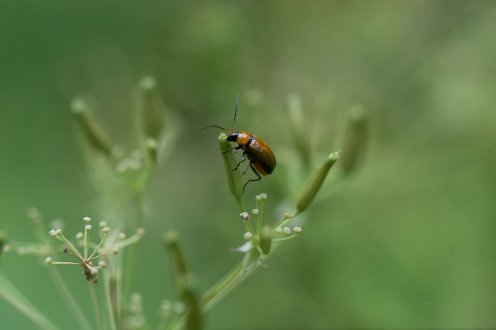 6mmぐらいの大きさで、動きは緩慢だが、捕まえようとすると葉の裏に隠れたり、飛んだりする。黒化個体や黄色い個体など変異が多い。シソ科、セリ科、マメ科などの食部を食べる。
