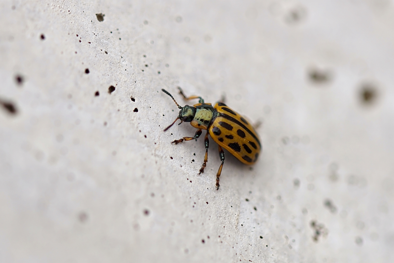 体長8mmほど。上翅は朱赤色で、左右各10個の黒紋を持つハムシ。斑紋には変異が多く、消失する場合もある。未成熟の個体は黄色い。
