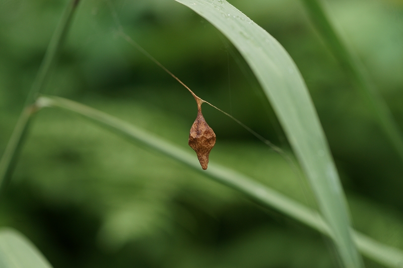 山地の水辺近くの葦やススキの葉の陰などで見ることができる。昼間はほぼ完全に植物の葉裏に静止している。その際には歩脚をしっかり体に引きつけるため、頭胸部と歩脚は腹部の前縁からわずかに覗くだけで「おにぎり」状となる。暗くなってから網を張り、枝先の葉陰などに不規則網のような形に糸を張り巡らしてそこに卵嚢をぶら下げ葉裏に潜む。