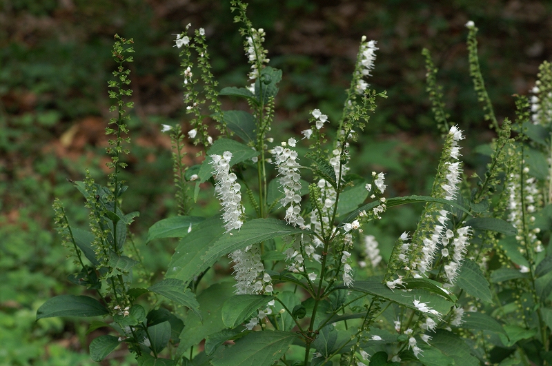 枯れた茎の根元に霜柱が出来るのでその名が付いた。秋に枝の上部の片側だけに白い花を咲かせる。