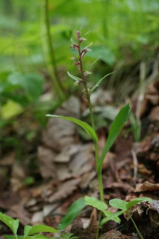 山地の湿った林内に生える。高さ20〜35cm。下部に鱗片葉が数個あり、葉はその上に3〜5個互生する。茎頂に薄緑色または紫褐色の花を数個つける。
