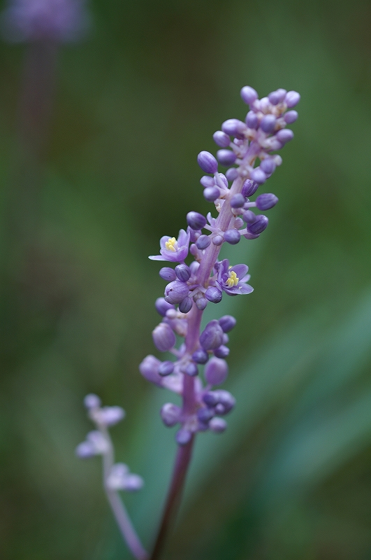 林の中に生え、花茎の先の花穂に薄紫色の小さな6弁花をたくさんつける。花の後には黒紫色の種子が見られる。名の由来は、葉の形が蘭(ラン)に似ていて薮に生えることからきている。