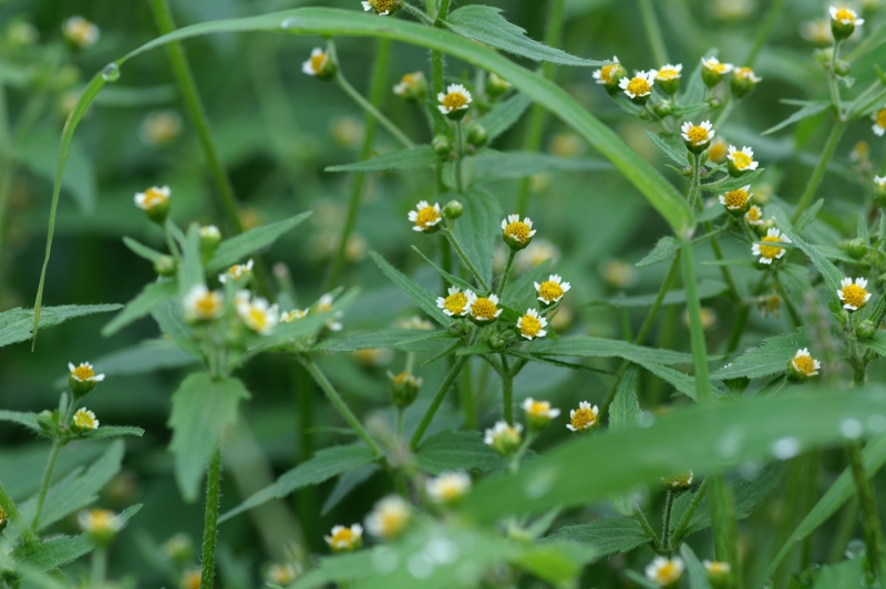 原産地は熱帯アメリカで、日本へは大正時代に渡来。 現在では、関東以西で帰化している。空き地や道ばたなどに生え、茎先が分かれて、花径5ミリくらいの小さな頭花をつける。 白い舌状花が5枚あり、先が3つに裂けている。 花の真ん中の筒状花は黄色い。大正時代に牧野富太郎博士が世田谷区経堂の掃溜(ハキダメ)でこの花を見つけて命名した。