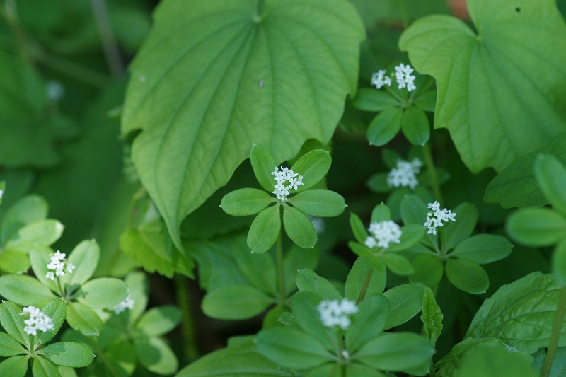 山地の薄暗い林の中で見られる。5mm弱の4弁花を数個付ける。、葉は6〜7枚の輪生で3〜4段付く。