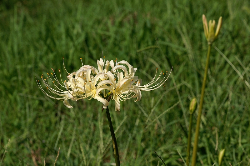 ヒガンバナの白化種。根際から生える葉は線形である。ヒガンバナよりも太い。 ヒガンバナ同様、葉のある時期には花は咲かず、花期には葉がない。