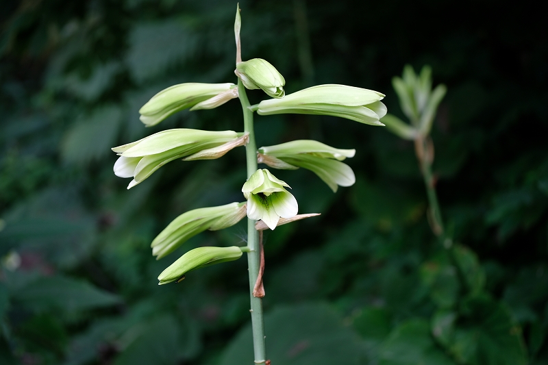 低山や山地の林の中や林の縁に生え、茎先に長さが7〜15センチくらいの緑白色の花を横向きにつける。 花被片は内側に3枚、外側に3枚あり、漏斗状となる。名の由来は、花盛りには葉が枯れているので、それを「歯がない」姥にたとえたものである。