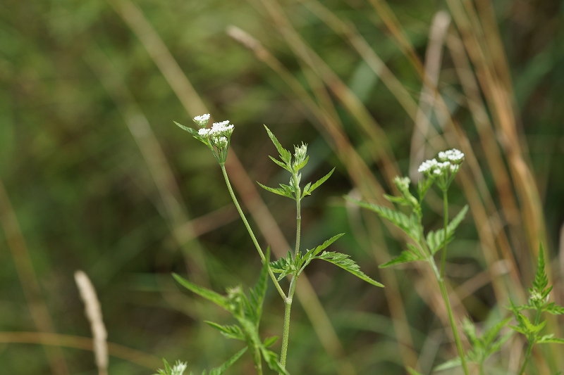 高さ30〜70cm。葉は長さ5〜10cmの2〜3回羽状複葉。小葉は卵状披針形で細かく切れ込み、両面とも粗い短毛が密生する。枝先に小形の複散形花序をだし、白色の小さな花をつける。